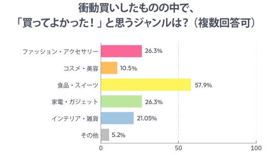 衝動買いの中でも「買ってよかった」と感じる割合が最も高かったのは、「食品・スイーツ」でした。