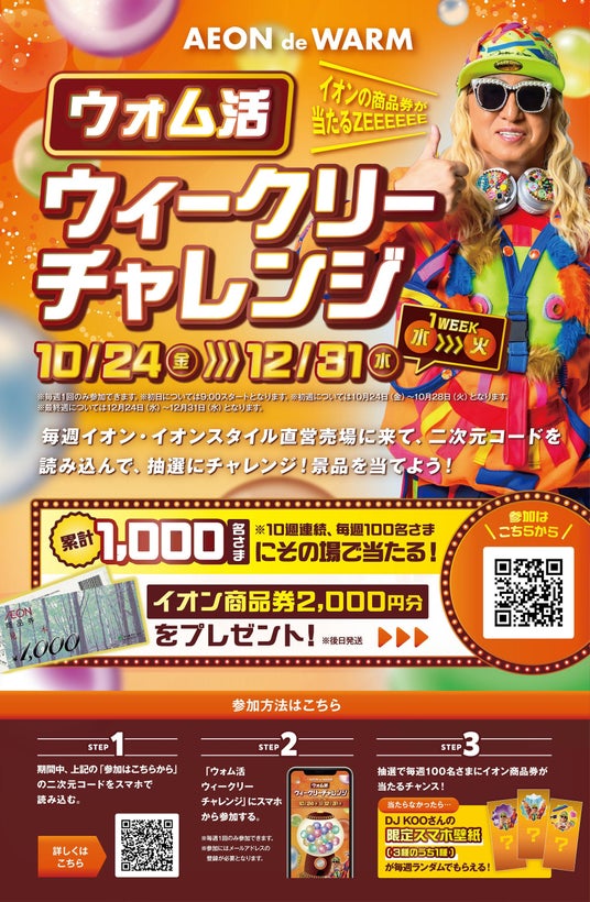 直営売場に設置された二次元コードをスマホで読み込むと、毎週1回※)「ウォム活ウィークリーチャレンジ」に参加できます。10週連続で毎週100名のお客さまにイオン商品券2,000円分を抽選でプレゼントします。