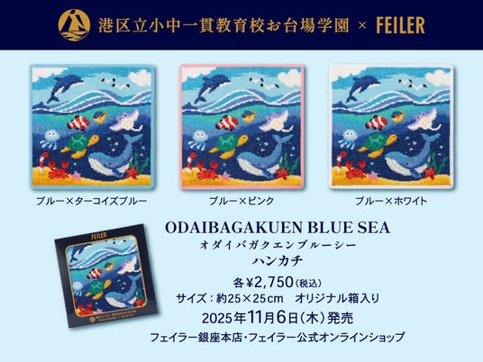 このたび、“ブルーシー”プロジェクトのハンカチはドイツでの生産が完了し、2025年11月6日(木)に、フェイラーの旗艦店であるフェイラー銀座本店およびフェイラー公式オンラインショップ( https://feiler.jp/ )にて発売することを発表いたします。フェイラー銀座本店では、2025年11月6日(木)、11月11日(火)の2日間16:30~18:30は、港区立小中一貫教育校お台場学園の子供たちが自らの手で商品を販売する販売体験を予定しております。ぜひ、作り手である子供たちから商品をお買い上げいただきたく、フェイラー銀座本店に足をお運びいただけましたら幸いです。その他、港区立小中一貫教育校お台場学園校内販売も行います(一般購入不可)。