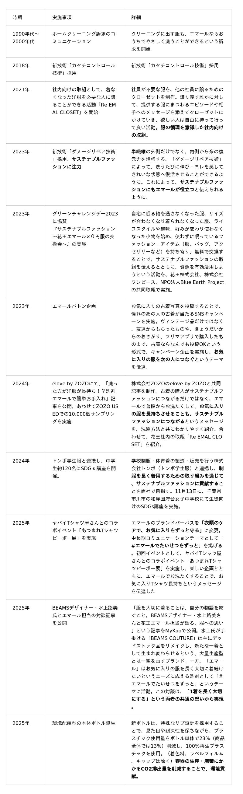 エマールが1990年代に「ホームクリーニング」(おしゃれ着を自宅で洗うこと)を提案してから30年近くの年月が経過し、時代の変化とともに「服の循環」や「サステナブルファッション」、「環境貢献」などの要素も取り入れながら今もなお進化しています。エマールはこれからもブランドパーパス「衣類のケアで、お気に入りをずっと守る」のもと、エマールを使う方々が衣類や地球環境にやさしいライフスタイルを送ることができるブランドを目指していきます。