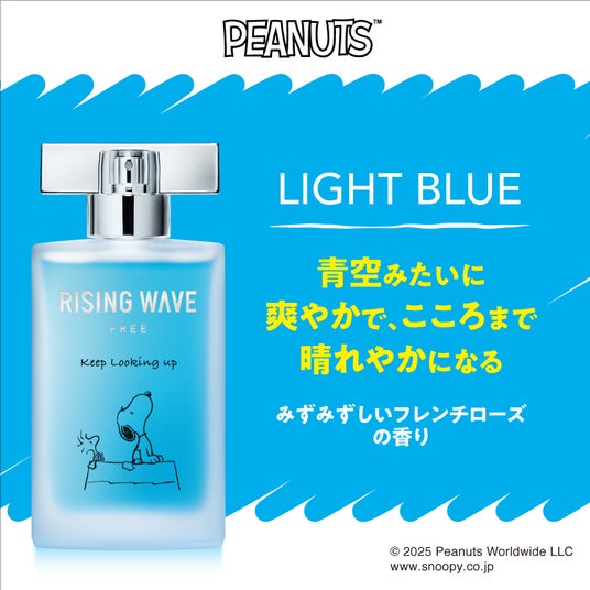2025年、ブランド誕生20周年を迎えた「ライジングウェーブ」。この記念すべきアニバーサリーイヤーに、ブランドのロングセラーフレグランス「フリーシリーズ」から、スヌーピーデザインの香水が登場します。ピーナッツのコミックに登場する『Keep looking up… That's the secret of life.』というフレーズ。「人生を通して前向きな気持ちを持ち続けよう」というメッセージは、空と海をテーマに“前向きな自分らしさ”を届けてきた「ライジングウェーブ」の想いと重なります。