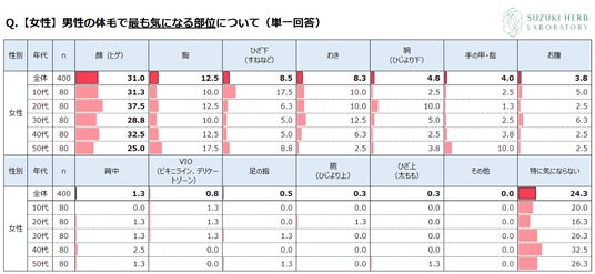 ・女性が男性の体毛で最も気になる部位は「顔(ヒゲ)」。