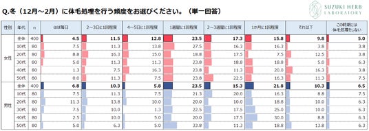 株式会社鈴木ハーブ研究所は、10代~50代の男女計800名を対象に「冬の体毛事情に関する調査」を実施いたしました。暦の上でも冬を迎える11月7日(金)を前に、調査結果の一部を発表いたします。=回答者数:800名(男女別で10代~50代 各80名)、調査日:2025年8月29日(金)~9月8日(月)、調査方法:インターネット、調査委託先:KJリサーチ=