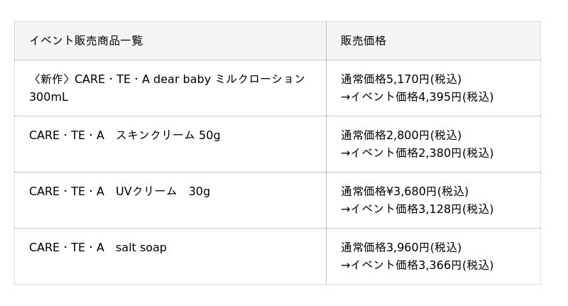 イベント特別価格としてケアテア全商品を【15%OFF】でお買い求めいただけます。
