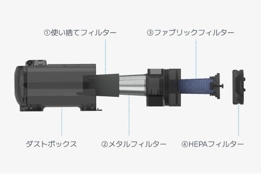 4重フィルター構造搭載で排気もクリーンで安心0.3㎛の超微細なホコリも99.9%集塵するHEPAフィルターなど4重フィルター構造でゴミをキャッチ。吸引力を維持しながら排気もクリーンに。