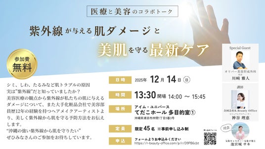 沖縄発のコスメブランド「Ruphoria(ルフォリア)」を展開する合同会社R. Beauty Office(本社:沖縄県那覇市、代表社員:神谷 理恵、以下R. Beauty Office)は、オリバー美容形成外科(本社:沖縄県島尻郡、院長:川崎 雅人)と共に、無料講演会「紫外線が与える肌ダメージと美肌を守る最新ケア」を2025年12月14日(日)、沖縄県浦添市「てだこホール」にて開催いたします。