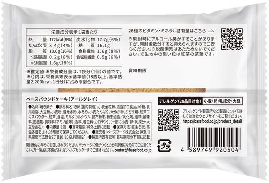 「パウンドケーキ」はその名前の由来の通り、大まかに卵、油、砂糖、小麦粉を1ポンド(pound)ずつ用いるという設計になっています。「BASE Pound Cake」はその条件を満たしながらも、他BASE FOODシリーズと同様に、全粒粉をベースとして主に自然由来の原材料をアレンジして製造されており、たんぱく質や食物繊維など33種の栄養素を摂ることができます。気になるカロリーも172kcal(BASE Pound Cake アールグレイの場合)と控えめの設計になっています。