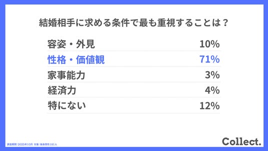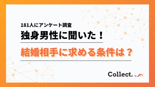 DMソリューションズディーエムソリューションズ株式会社(東証スタンダード上場)が運営するメディア「Collect.(コレクト)」では、独身男性181人に結婚相手に求める条件のアンケート調査を実施しました。