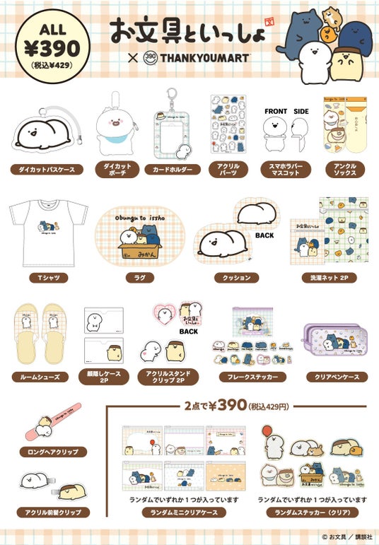 「Be Smile, Be Kawaii」をテーマに、キャラクターの限定アイテムを中心としたカワイイ推しグッズがいつ来てもALL390円で手に入るショップ「サンキューマート」(エルソニック株式会社)は、イラストレーター「お文具」によるキャラクター作品「お文具といっしょ」とのコラボレーション雑貨を、全国のサンキューマート店舗で11月下旬より入荷次第販売開始いたします。