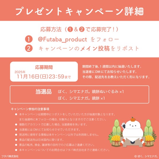 フタバ株式会社『フタバ株式会社』(本社:愛知県名古屋市、代表取締役社長:市川 宗一郎)は、「ぼく、シマエナガ。鏡餅ぬいぐるみ」と「魚沼産こがねもち米100%使用 ぼく、シマエナガ。鏡餅」が当たるプレゼントキャンペーンを2025年11月6日(木)~11月16日(日)の期間で実施いたします。