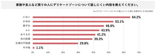 デリケートゾーンについて相談しにくい内容1位「におい」、2位「かゆみ」。「におい」や「かゆみ」は、人に最も相談しにくい内容であり、かつ最も悩みが多い内容であることが判明しました。