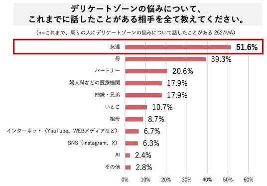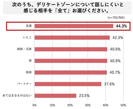 - デリケートゾーンの悩みの相談相手は「友達」が最多である一方、最も相談しにくい相手1位も「友達」。