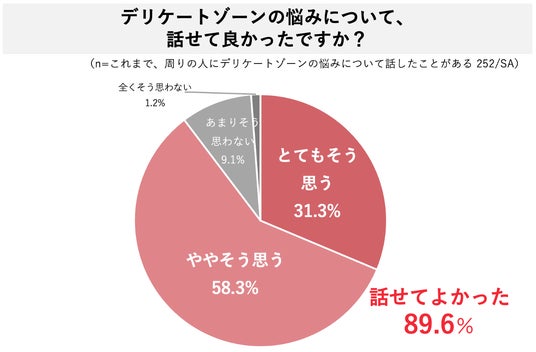 - デリケートゾーンの悩みについて、周囲に話した経験のある人のうち9割が「話せてよかった」と回答。