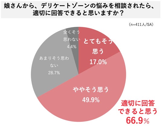 母世代の3人に2人(66.9%)はデリケートゾーンの悩みをされた時に、適切に回答できると回答。女性全体の7割以上がデリケートゾーンケアを誤っていることを踏まえると、自身のケアが誤っていることを知らないまま、子どもたちに誤ったケア方法を伝えている可能性も浮き彫りとなりました。