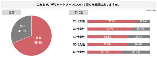 これまでデリケートゾーンについて悩んだ経験がある人は約7割(68.9%)にのぼっています。また若い世代ほど悩んだことがある人が多く、20代はおよそ8割にのぼっています。