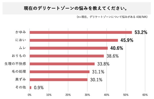 - 現在、デリケートゾーンに悩みがある人は6割超。悩みは「かゆみ」「におい」「ムレ」が上位に。