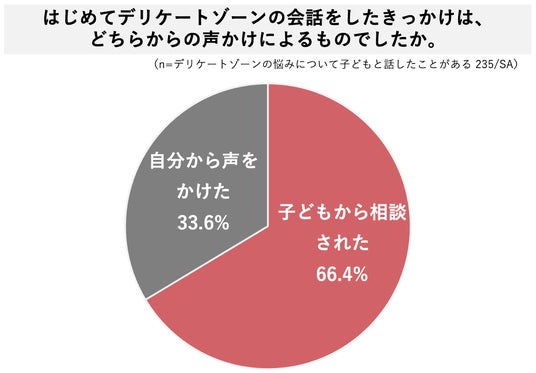 娘がいる30~50代女性に話を伺ったところ、約4割(42.8%)はデリケートゾーンの悩み(生理含む)について子どもと話したことがないことが判明。さらに話したことがある人は、66.7%は子どもから相談されたと回答し、自分から声かけをしているのは3割程度(33.6%)にとどまりました。小学生以下の女の子たちが、現在も一人でデリケートゾーンについて悩んでいる可能性があることが予測できます。