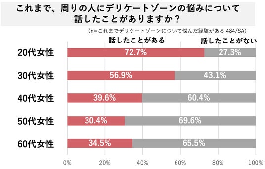 - 周囲にデリケートゾーンの悩みを話したことがある人は、20代が7割以上に対し、40代以上は4割未満にとどまった。