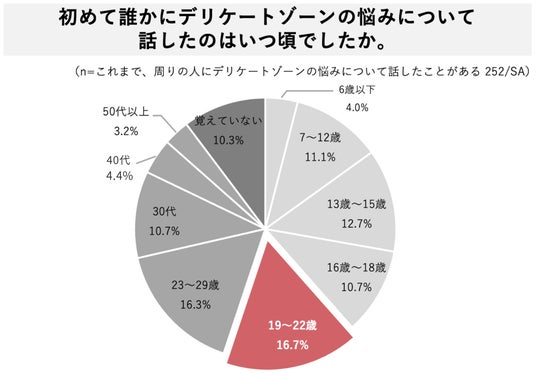 その結果、現在6割以上の女性がデリケートゾーンに悩みを抱えており、全体の半数以上が、デリケートゾーンの悩みを誰かに話したかったにも関わらず話せなかったと回答。悩み始めた時期については、若い世代ほど早い傾向にあり、20代はなんと4人に1人が「小学生以下」から悩んでいたことが明らかになりました。