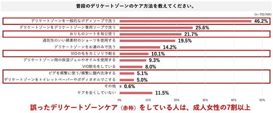 デリケートゾーンの普段のケアが誤っている人は7割以上。大多数の人が、正しいデリケートゾーンケアを知らないことが明らかに