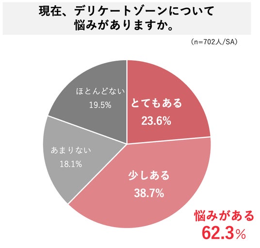 現在、デリケートゾーンについて悩みがある人は6割超(62.3%)。現在の悩みについては「かゆみ」「におい」「ムレ」が上位となりました。