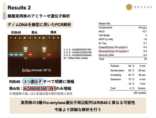 RIB40株はすでにゲノム情報が明らかにされており(*1)、3つのα-amylase遺伝子(amyA, amyB, amyC)が存在することが明らかになっています。PCRを用いた遺伝子解析の結果、麹菌実用株とRIB40株ではこれらの遺伝子の近傍の構造が異なることが示唆されました。