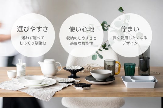 「選びやすさ」「使い心地」そして「佇まい」。この3つの視点をもとに、毎日の食卓に溶け込む、どんな料理や空間にも馴染むテーブルウェアをセレクトしています。