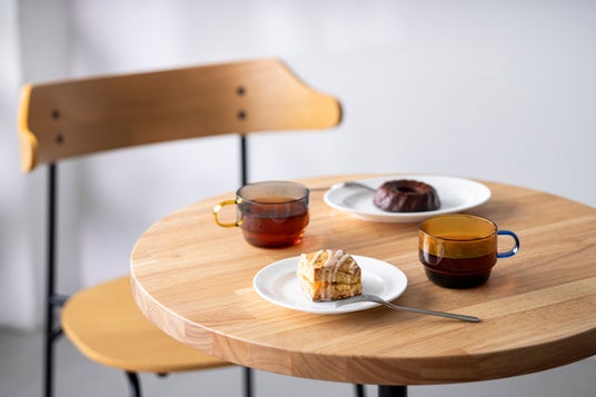 1. 明るめの木天板ラバーウッドナチュラルやオークなどの明るいトーンの天板には、フラットなフォルムやガラス素材などすっきりとした印象の器を。