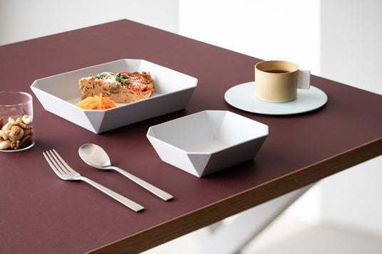 4. カラー天板リノリウムやFENIXなど、カラーが際立つ天板にはシャープなフォルムやシンプルな白磁の器を。