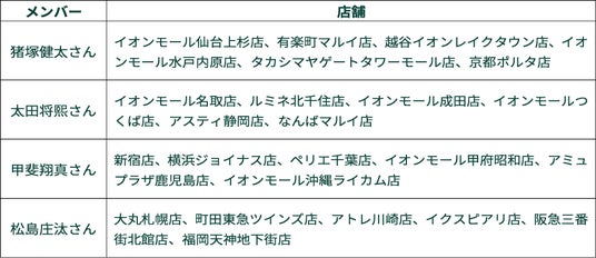 キャンペーン期間中、一部対象店舗でメンバー4人それぞれの選んだアイテムのおすすめポイントなどを収録したコメント映像を放映いたします。対象店舗は以下です。