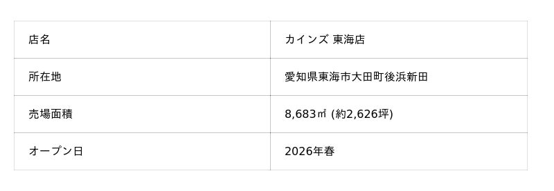株式会社カインズ株式会社カインズ(本部:埼玉県本庄市、代表取締役社長 CEO:高家 正行)は、カインズ 東海店が2026年春に、愛知県東海市にオープンすることをお知らせします。愛知県内への出店は、2025年10月にオープンしたカインズ 岡崎美合店に次いで14店舗目、東海市へは初の出店です。