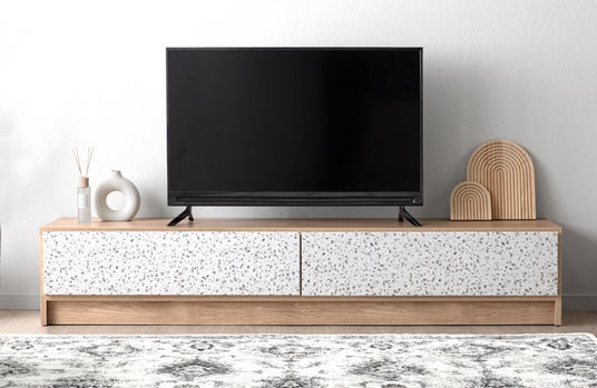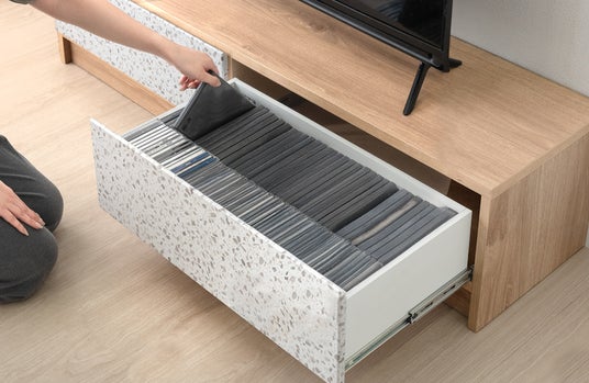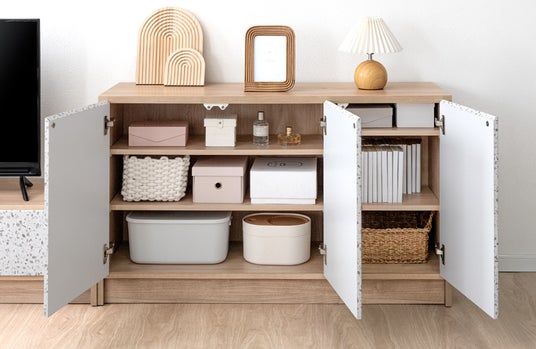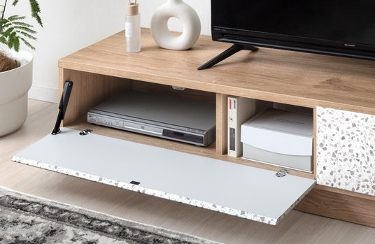 テラファニシリーズのテレビボードは、左側がフラップ扉を採用しており、ルーターやHDDなど高さ20cmまでの機器を収納でき、配線もしやすい設計になっています。右側の扉にはフルスライドレールの引き出しを備え、DVDやゲームソフトなどすっきり整理できます。また、取っ手をなくしたフラットなデザインで、テラゾー柄の存在感を引き立てながら、お部屋に統一感を与えます。