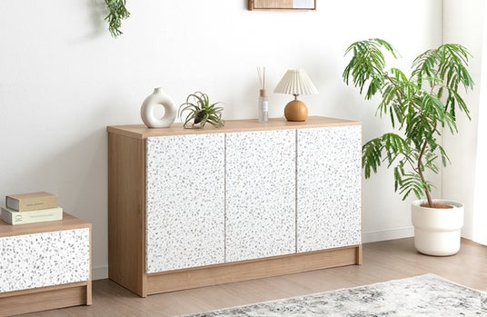 「テラファニ(Terrafurni)」は、タンスのゲンが展開している“Terrazzo furniture(テラゾーファーニチャー)”を略したシリーズ名称です。イタリア発祥の建材である「テラゾー(terrazzo)」の美しい意匠性を家具に落とし込み、日常空間に馴染むデザインに仕上がっています。建築やインテリアで再注目されるテラゾー柄を、木目調と組み合わせてナチュラルモダンな雰囲気に演出します。