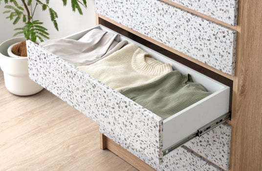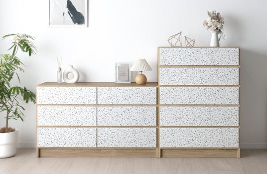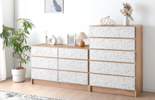 チェストは高さ違いのハイタイプとロータイプの2サイズ展開です。引き出しにはフルオープンスライドレールを採用し、奥の物までスムーズに取り出すことができます。衣類や小物を整理しながら、天板上には写真立てや小物を飾ってインテリアの一部として楽しめます。テラゾー柄と木目調のコントラストが空間に上質感があり、寝室やリビングなどどんなお部屋にも自然と馴染みます。