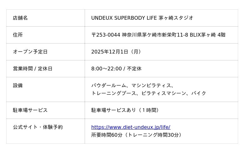 「UNDEUX SUPERBODY LIFE」(アンドゥスーパーボディライフ)は、株式会社フィットクルー(本社:大阪市西区、代表取締役:鹿島紘樹)が展開する女性専用の月額制フィットネスジムです。この度、2025年12月1日に神奈川県茅ケ崎市に茅ヶ崎スタジオをオープンいたします。