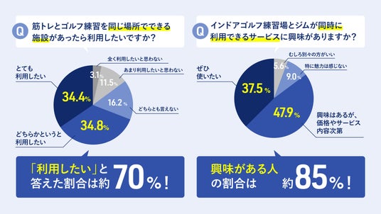 さらに「ゴルフ練習と筋トレを同じ場所でできる施設があれば利用したい」と回答した人は70%で「インドアゴルフとジムを同時に利用できるサービス」に対しては85%が利用を検討すると回答しました。