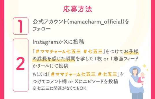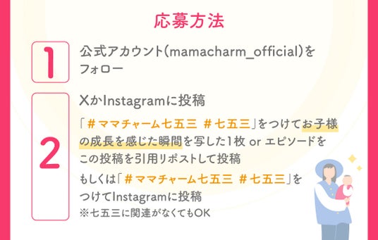 Xの場合、#ママチャーム七五三 #七五三 をつけて、お子様の成長を感じた瞬間を写した1枚orエピソードをママチャーム公式アカウントのキャンペーンについての投稿を引用リポストして投稿してください。