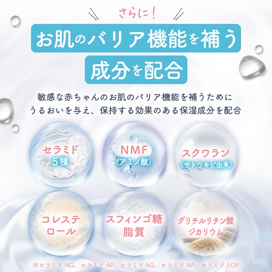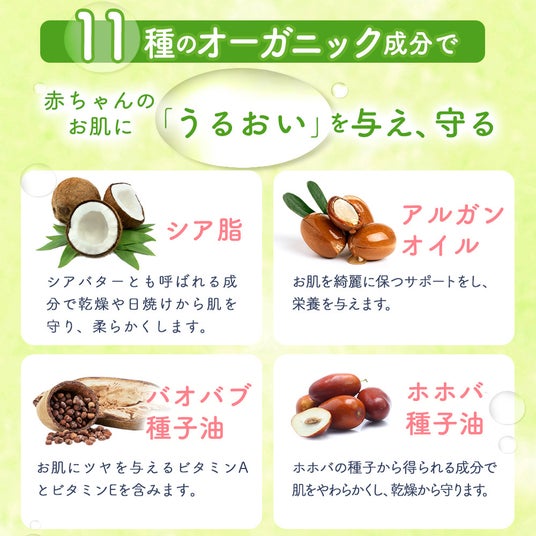 赤ちゃんのお顔から全身まで使える、天然由来成分99%のミルクタイプローション。シア脂やホホバ種子油など11種のオーガニック成分に加え、セラミドやNMF(天然保湿因子)などの保湿成分を配合しました。乾燥しがちなお肌にうるおいを与え、しっとりとした状態を保ちます。高保湿でありながらベタつきにくく、サッと塗りやすい使用感。合成香料不使用で、柑橘系のやさしい天然アロマがほんのり香ります。11種類の無添加処方で、デリケートな肌にも配慮しました。