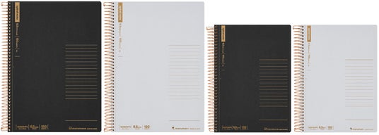 昨年発売10周年を迎えた「スパイラルノート ベーシック」は、日本で初めてリングノートを発売したマルマンが、“書きやすさ”と“使いやすさ”にこだわって開発した定番シリーズ。昨年発売した150枚タイプは、その1.5cmの分厚さとたっぷり書ける安心感で、学生からビジネスパーソンまで幅広く支持されています。機能的でスタイリッシュな印象の〈ブラック〉とやわらかく洗練された印象の〈ライトグレー〉が新登場。特別感のある上品な箔押しを施しました。昨年発売をしたクラフト表紙とはまた異なる落ち着いた佇まいが魅力です。日常使いはもちろん、勉強や仕事にもなじむ仕上がりで、“書く”時間をよりスマートに、豊かに彩ります。6.5mm横罫A5・B5の2サイズ展開です。