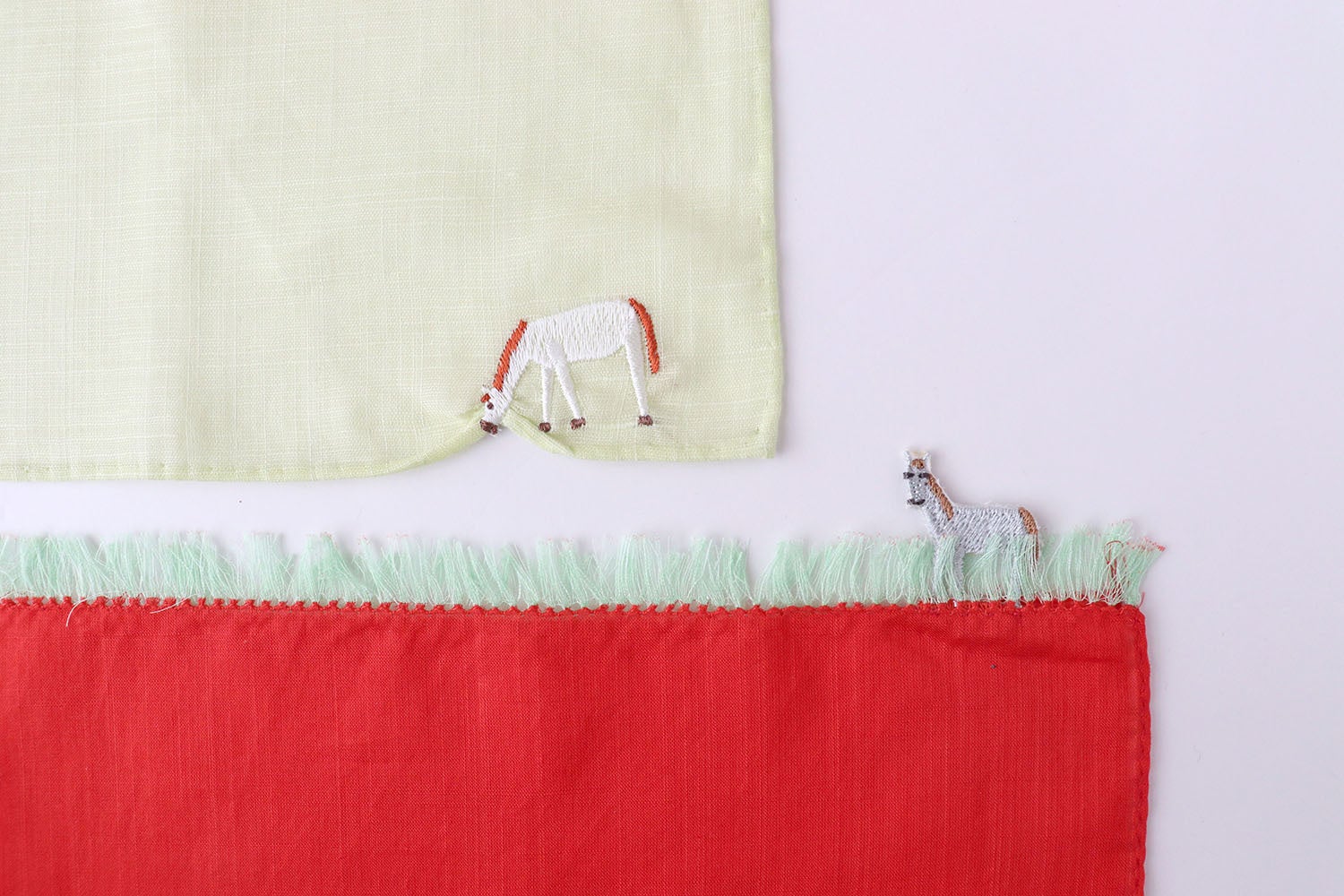 大草原に見立てたハンカチの縁を、引っ張りながら草を食べる馬の様子を刺繍で表現しました。クラシクス・ザ・スモールラグジュアリでは長年愛されている「HIKKOMI(ひっこみ)」シリーズの一つです。ユニークで遊び心溢れる一枚は、ご自身用はもちろんギフトにもぴったりです。