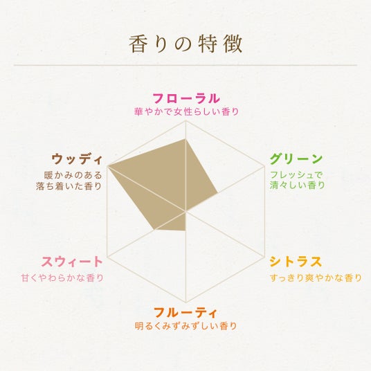 フレッシュな甘さのフィグやアプリコットに、ライラックのフローラルが組み合わさった、みずみずしいさわやかな香り。