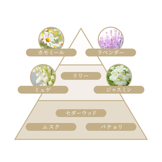 清潔感のあるジャスミンに、ほんのり甘いカモミール・セダーウッドを加えた、上質で心やすらぐ香り。