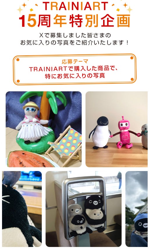 いつもTRAINIARTをご利用いただいているお客さまと一緒に15周年を盛り上げたいという思いから、Xにおいて「TRAINIARTで購入した商品で、特にお気に入りの写真」というテーマで画像を募集いたしました。集まった画像は、JRE MALL内特設ページに掲載させていただきます。