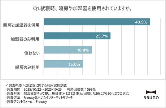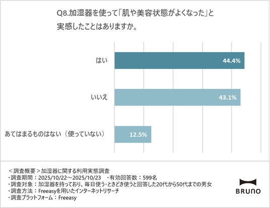 インテリア雑貨およびライフスタイル商品の企画/開発/販売を行うBRUNO株式会社(本社:東京都新宿区、代表取締役社長:塩田徹)は、毎年多くの人々が乾燥に悩まされる秋冬シーズンに向けて、20代~50代の男女599名を対象に、『加湿器に関する利用実態』について調査を実施しました。