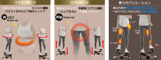 ・「エアロモード」での上下の運動と「ツイストモード」でのひねりの運動ができることで、ウエストや内腿の筋肉をしっかり使うことができます。