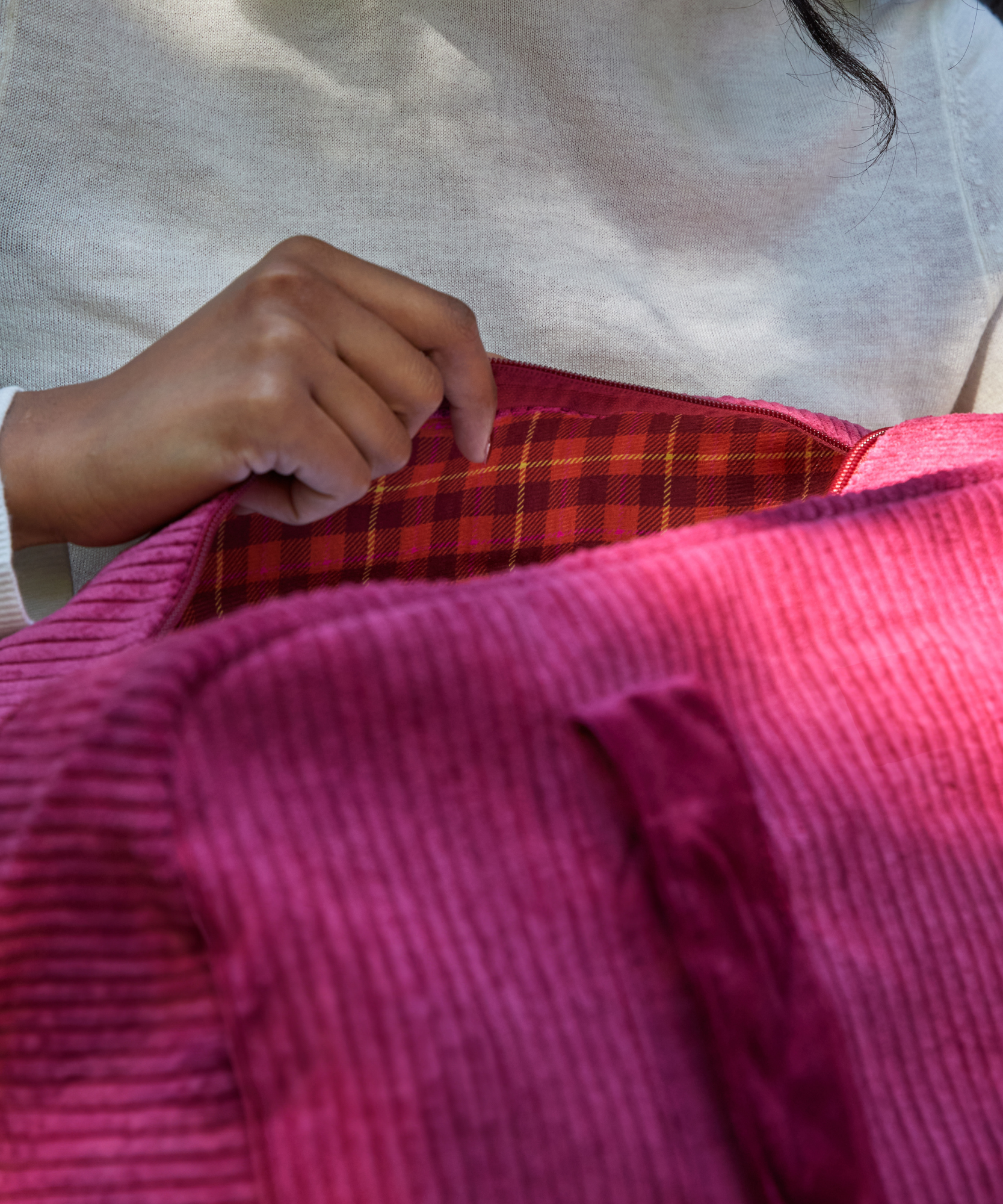 表生地はしっかりとした美光沢のコーデュロイ素材。裏地のオレンジタータンチェックがアクセント。