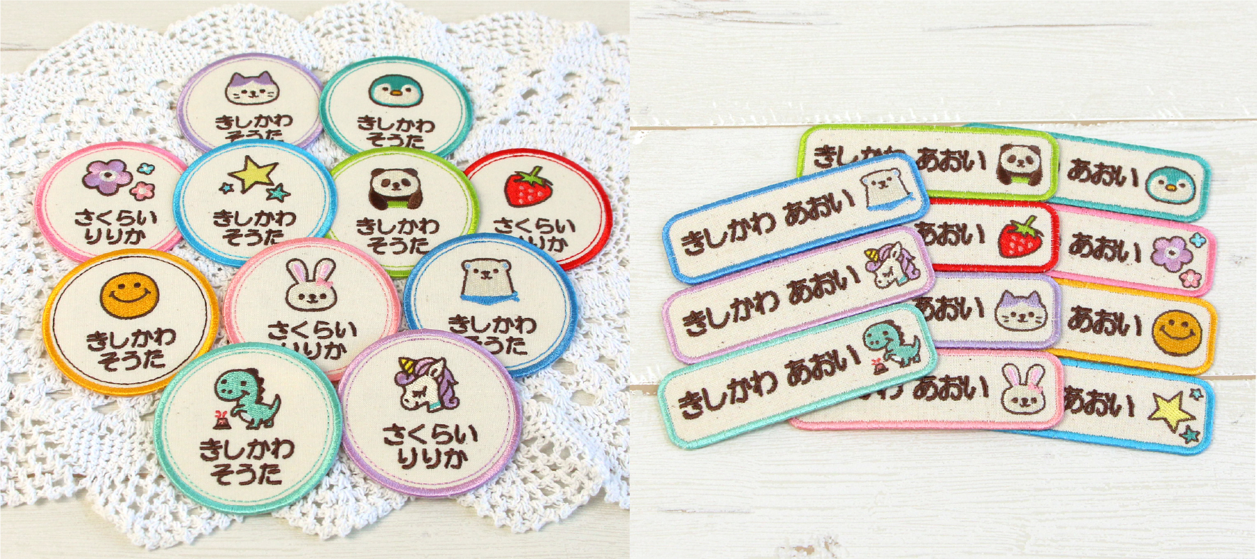 当店人気No.1商品であるお名前シールの人気デザインをセレクトしたイラスト入りから、シンプルなワッペンまで様々なバリエーションをご用意。デザイナーが生地・糸の色までこだわって企画しました。