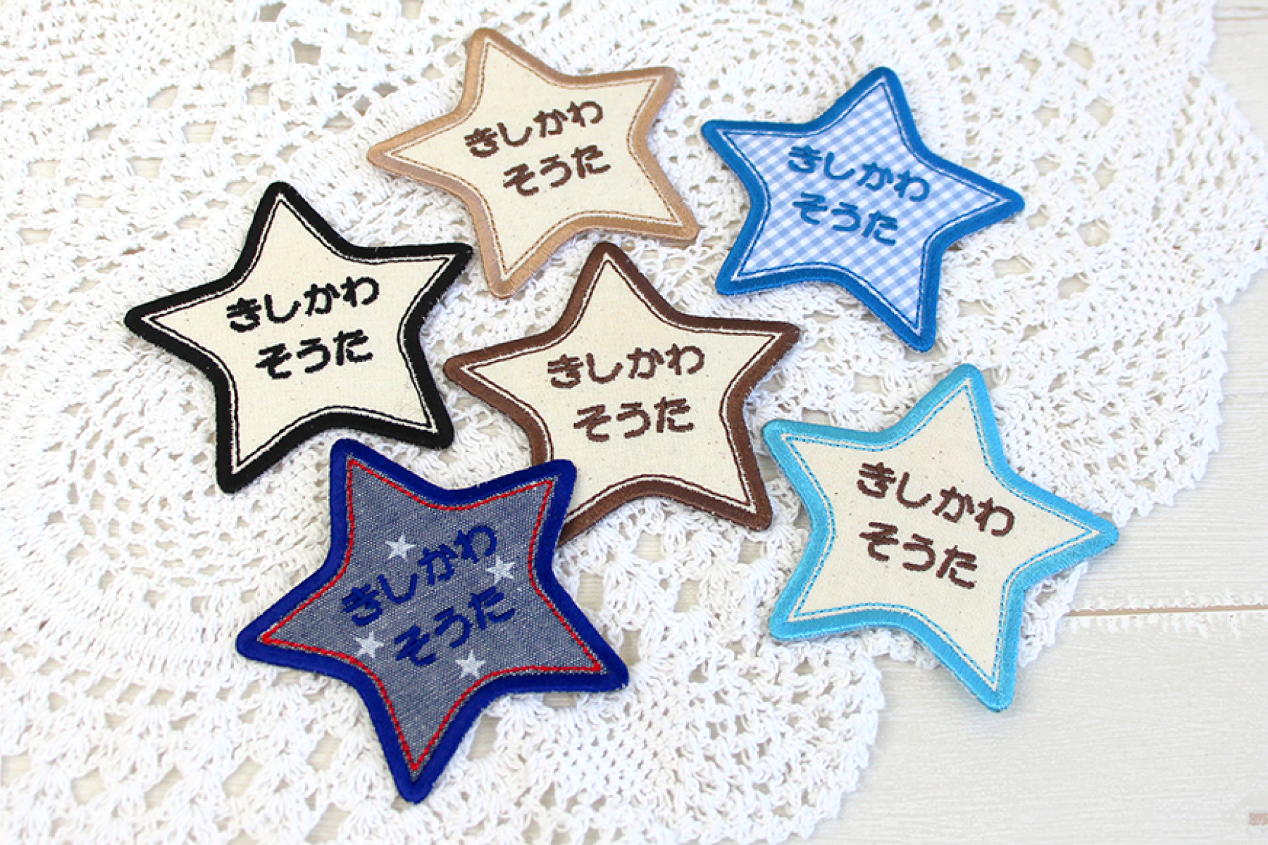 生成生地やパターン生地を使用した、サイズ違いのお名前ワッペンです。