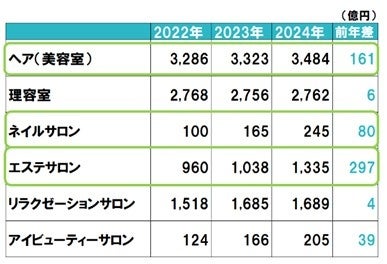 2022年から3カ年の「男性の美容サロン利用」は、美容の全ジャンルで年々市場規模が拡大。ネイルは前年からプラス80億円と、エステやヘアに続き数字を伸ばしている。