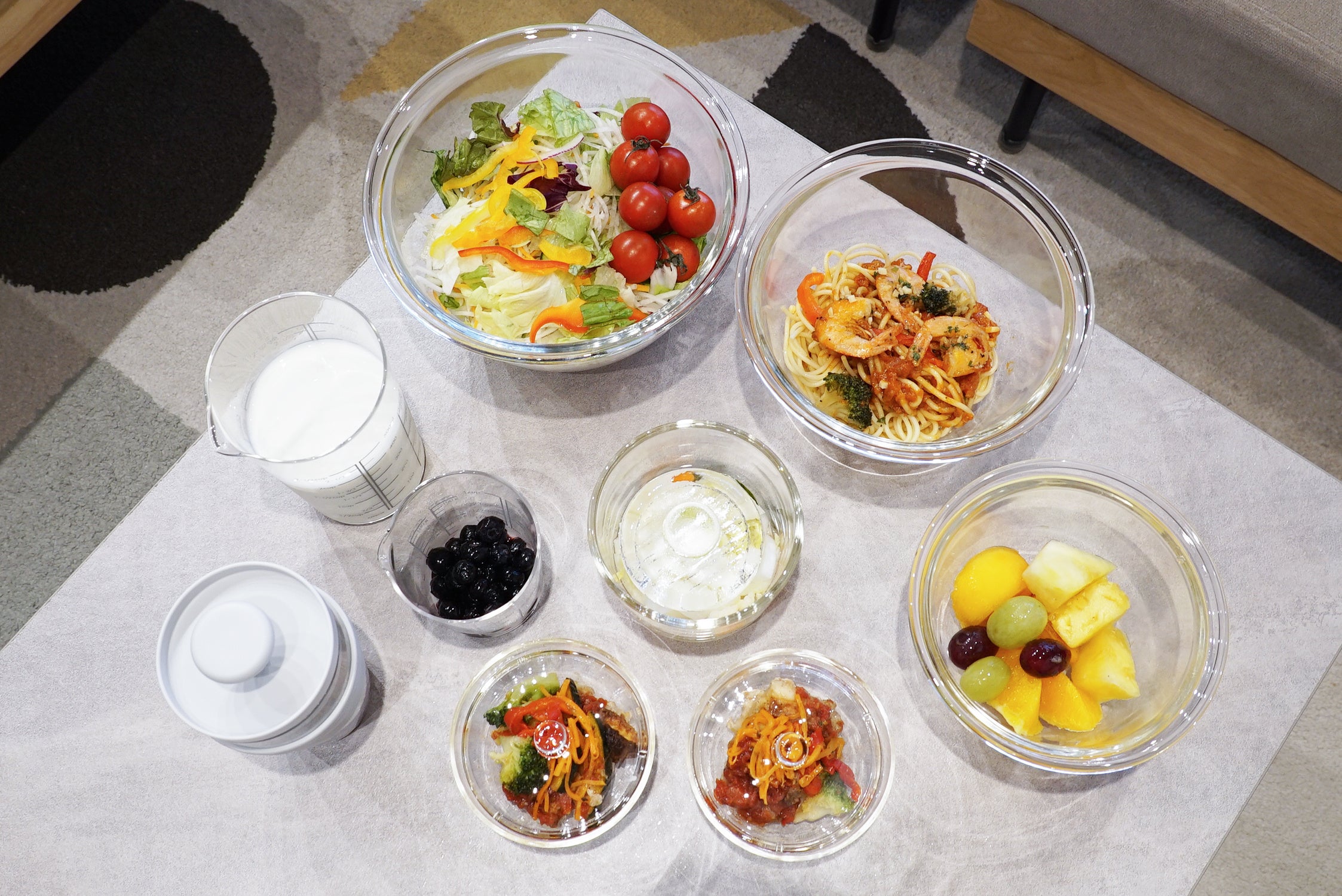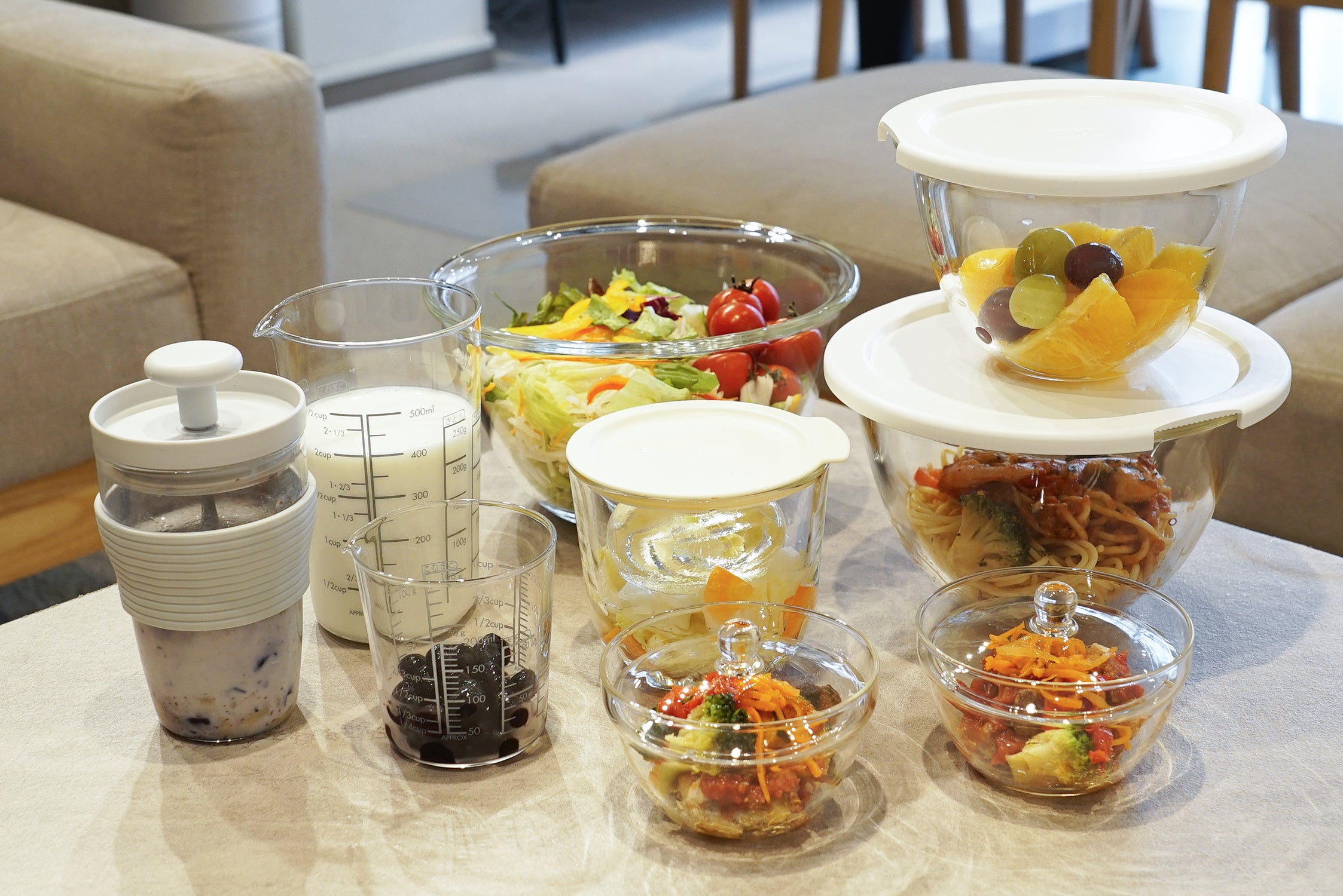 ネットショップ限定の「ガラスのレンジ小鉢」や、フタ付きの耐熱ガラスボウル、メジャーカップなど、毎日の下ごしらえから食卓まで快適に彩ってくれるアイテムを詰め合わせました。